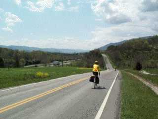 | biking today was just about as perfect as biking gets. picture this: back country roads along rippling streams, some rolling hills, sunshine, blue skies, big fluffy white (some gray) clouds, temps hovering around 80 by afternoon, lots of goldfinches, lilacs, redbud trees, tulips, honeysuckle starting to blossom & spreading its heavy sweet odor everywhere, white & pink dogwoods, phlox--both the light purple wild kind & the tamer, colorful, creeping clumps--neglible winds, & courteous drivers....tho' our route was mostly VERY low traffic, so no drivers at all. in fact, drivers have been courteous for the whole trip so far. |
