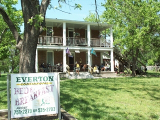 | everton boasts 250 people; you wouldn't expect to find a b&b here. but in 1994, jean & ron dinges renovated the railroad-era poindexter hotel, built in 1886. locals didn't expect it to succeed, but that's before anyone realized what a haven it would become for cross-country bicyclists needing a place to sleep. bikers can pitch their tents in the big yard or they can use one of the 5 bedrooms in the house. our group is taking over the whole place. the dingeses seldom meet their guests; for them the b&b is a part-time job. a hand-written note near the phone downstairs instructs guests to have a good time, use whatever they need, & leave payment for their lodging on the table before they leave. |