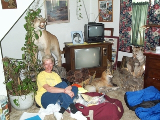 | the house is absolutely filled with everything from furniture loaned by local people to collections of dolls & teddy bears borrowed from growing grandchildren. there's a full bath up & one downstairs. several volunteers from our group have agreed to share the beds in the bedrooms & the rest of us are vying for floor space for our thermarests & sleeping bags. joan, lin & i are sleeping with the animals....several stuffed ones. |