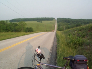 | after about 14 miles of hills, the terrain flattened out. but by then we were in the grip of ferociously strong southerly winds that plagued us the entire day. 2 riders didn't bike at all today, 3-4 others sagged in from different points on the route. patty stopped the van to pick up a couple of riders 15 miles out; she quipped that if our route had been heading north we'd be in canada by now. after we got to pittsburg late afternoon i called the local airport; they said that winds today had gusted up to 40-45 mph. i think those winds back in missouri were stronger. that's where we were most of today. |