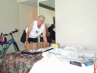 | here's a photo of patty with stuff spread all over her bed & the box that'll go back home. | ![]() |