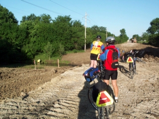 | sometime around 2 we turned north & headed into chanute on a more heavily traveled highway. patty fainer & i were riding ahead of sari. when i got up onto a little wider piece of pavement i stopped to wait for sari. all of a sudden, i heard a loud clatter of bicycle parts right behind me & looked back to see patty fainer, feet still in toe clips, falling sideways onto the pavement. she laughed, unclipped her feet, & picked up herself & her bike. as it turns out, mud had caked into the bottoms of her biking shoes during her portage across the creek, & the mud was now so hard that she couldn't get in & out of the clips easily. once she was back on her bike & sari pulled up, we renewed our trek toward the motel. again after a few blocks i decided to stop & doublecheck directions & wait for sari. & again, clatter-clatter-clatter behind me. & again patty fainer laughed & picked up herself & her bike. i told her she was a one-person 3 stooges routine. |