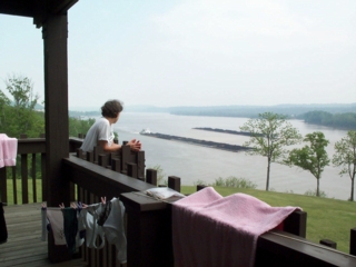 | the town of cave in rock, pop 400, is on the river's edge. after disembarking the ferry, we pedalled less than a mile to the cave in rock state park, where we're staying tonight. our group uses up all 8 of the park's overnight accommodations. & boy are they nice....large rooms each with 2 double beds, a little kitchenette with sink & small fridge, large bathrooms, & decks with spectacular views of the ohio river & all the traffic on it. |