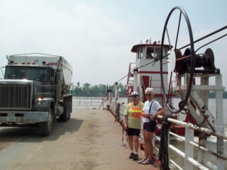 river for our ferry ride into illinois by late morning. sari, judy & i happened to draw near the ferry just as it was leaving the kentucky shore, but the tugboat workers saw us coming & waited for us to board. |