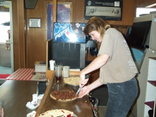| judith immediately came by to tell us that the little "country kitchen" restaurant across the parking lot had fresh homemade pie, so sari, patty fainer, & i headed over there immediately. (i had begun to think that we were out of the homemade pie belt.) we heard that the fresh rhubarb was delicious. but when we got to the restaurant, the waitress told us that one of our group had just come over & bought the last 2 pieces. harrummph. so we asked what else there was. she pointed out the ones on the counter, then said, "oh, there's also a pecan that just came out of the oven." OH BOY! polly, the waitress, went into the kitchen to get the pie & brought it out to the counter. here she is cutting it: |
