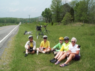 | by the time we left the cafe, the showers had lessened to a sprinkle. even those didn't last long. actually, just before we left, sue (this afternoon's subaru driver) had stopped by to tell us that the plan for staying overnight at camp carew, a presbyterian camp, had fallen thru, so we'd need to bike a few more miles to another place. knowing that meant even more hills, we were pretty thrilled. |