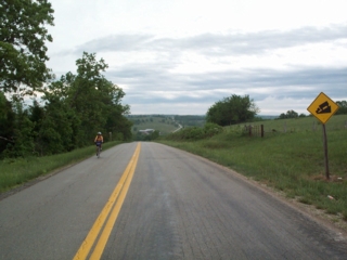 | we had almost gotten out of town when the sprinkles got heavier. we stopped to put on more rain gear & before long the rain was steady & heavier, but it lasted less than 4 miles & less than 20 mins. after that the only time it rained it was sort of a heavy mist...not terrible by any means. from what we hear tonight, most bikers--the ones who rushed ahead today to beat the storm--got lots wetter than we did at the back of the pack. |
