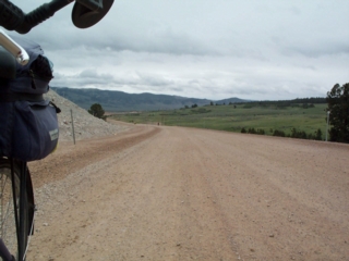 | as if the bumps & gravel weren't enuf of a challenge over the top of the pass, there were spells of more numerous raindrops & of stronger headwinds. we decided this was one of those experiences that qualifies as the adventure aspect of this trip. |