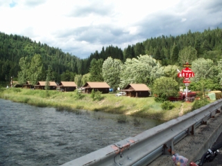 here's a photo of our resort here in lowell that i took yesterday from the bridge over the lochsa that gets us over to the resort. our staff are staying in one of those cabins on the shore. notice under the motel sign the pile of rubber rafts & the old school bus used to take raft-riders to their point of departure up the lochsa. isn't it a beautiful setting? |