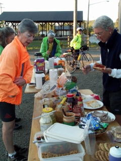 | here's a photo of the mad rush at the table where riders make sandwiches, bagfuls of gorp &/or cookies, & their breakfast. notice at the far end of the photo that deanna is already leaving on her bike; she, lin, & darleene tend to leave town for the day's ride just about the time the rest of us are starting breakfast. around the table from left are lee, behind her barely visible is phyllis, at the far end is darleene, & at right spreading her daily peanut butter & jelly with fervor is patty fainer. | ![]() |