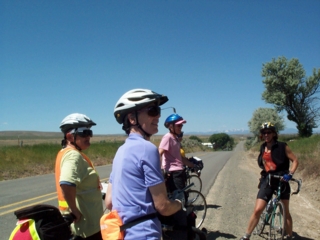 you can see some snow-capped peaks in this photo of some riders who stopped to greet patty the chef, who was riding in our direction from baker city. she drives the van & trailer from one overnight town to the next, then often has time to go out biking before tackling her many responsibilities. from left in the photo are judy, lee, patty fainer, sari (barely visible), & patty the chef on the right. |
