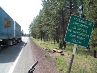 | headwinds made our last few miles to the summit quite a strain, but fortunately the climb itself was quite gradual. near the top we saw some signs that surprised us....signs i've never seen before. here's the spanish version; in the bargain you got a look at one of those giant trucks so common along our route today. these seem to be more like 2 trucks pulled by one cab. | ![]() |