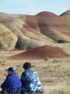 | we piled into the van & subaru for the 6-mi drive to painted hills. these are composed mostly of claystone layers, which include ancient soils & lake beds. mixtures of various elements produce beautiful colors on these hills. |