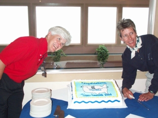 | tonight at 6 we gathered in gloria's suite for a cocktail party. all visiting friends & family joined us. then at 7 we had a bikers' last supper. the meal was delicious; the motel decorated a cake with a US map showing our route & the words "congratulations transamerica 2000 - 4140 miles." |