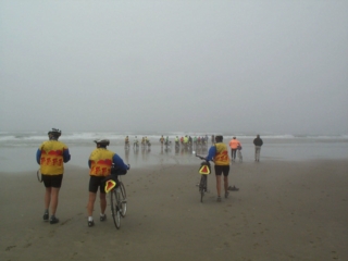 | it was getting very warm as we pedalled in the bright sunshine, but as we neared the ocean we could see huge clouds of fog & the temps started dropping. for the last 10 miles we had strong headwinds. but of course we were inspired, so on we went 'til we reached the assigned rendezvous spot on the edge of florence. a police escort was ready to usher us through town. |