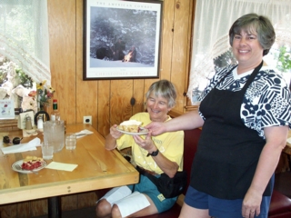 | we 3 roommates these 2 nights--sari, judy, & i--weren't up 'til 6:45 or so; the morning before it was 4:45. at around 8 we joined several others to bike or walk downtown to the cowboy cafe for breakfast. what great food! at rose's suggestion, many of us ordered the veggie skillet & boy were we glad we did! it was a bed of cowboy potatoes & other veggies (chopped onions, peppers, fresh tomatoes) & real cheddar cheese (melted) topped with 2 eggs your way (mine were over easy). it came with 2 slices of good wheat toast, & on the table they had tasty blackberry & boysenberry jams. it's always so nice on layover days to enjoy a slow, relaxing breakfast, & it's even nicer when it's tasty, as today's was. |