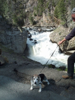 one of our first stops was at a beautiful waterfall. this picture doesn't give you an adequate idea of how far down from the edge of the parking lot the water was falling. that beagle felt the same way i did about getting near the edge. his name is sherlock & he's 12 years old. |