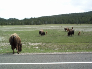 | here's a shot of a few near our tour bus. notice they're molting this time of year. notice also that there are lots of buffalo (bison) calves. we got lots of warnings about getting too near the animals. | ![]() |