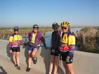 | initially we continued riding thru the irrigated fields that i described yesterday. here's one of the larger canals that we passed over. from left, there are roma, becky, bev, & loralee. i rode today with roma; she did the odyssey bike ride around the world in 2000. i really enjoy hearing her stories from that ride...& lots of other adventures. |