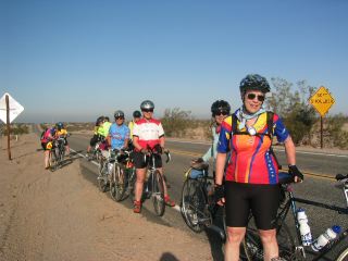 | sue did a great job today with the subaru.....providing us water & other assistance at crucial points along the way. as she said, there was no way to drink enough water today. no matter how much you drank, the winds & heat took their toll in a hurry. at about 25 mi out of blythe, there was a group of us stopped at a wider place in the road (there weren't many of those, so we tended to take advantage of them for a short rest stop). it wasn't long before sue pulled up in the subaru with her welcome load of water. as several of us were about to leave, we heard a sssssssssssssss & looked around. there was karen's back bike tire deflating before our very eyes. as discouraging as that was, how lucky that sue was there with everything needed to fix the flat in short order. |