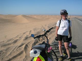 | you notice that we still had on warmer gear along the canal in the first photo, but by the time we reached the dunes, we'd stripped, because the sun was heating things up in a hurry. michelle told us yesterday that she & catherine would drive the van to a point 40 mi out into the dessert & have lunch for us there. as it turned out, we had a very rough stretch of headwinds just before lunch; as we pedalled against the winds, our eyes searched the dunes for the white van. & when we thot we spotted it, we feared it was a mirage. but fortunately it truly was the white van...a real oasis!...& we were very relieved to stop, eat, & just rest for a while. |