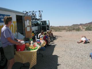 | here we are huddled against the shady side of the van; that was the only shade we'd seen in a very long time. catherine is there sprawled in the sun...& she wasn't even riding today; she's probably still recovering from her recent bike trip in africa. to the left is michelle, our cook & tour leader, who kept lunch provisions well-stocked. |