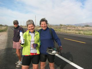 | here are rita (green jacket) & elaine, good friends from freeport, maine, at a sagstop at about 20 mi. that's sue behind them; she's today's sag driver (a very good one; we're sorry she'll be leaving us in a day or 2). rita & elaine taught school for many years at the same grade school in freeport, rita 4th grade & elaine phys ed. notice the oh-so-straight road & the beautiful landscape; the mountains in the distance seemed almost purple in the day's early light. |
