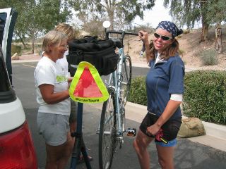 | today michelle drove the van & catherine biked the route, but she hadn't even changed out of her biking clothes before she was working on karen's bike, as you can see in this photo. |