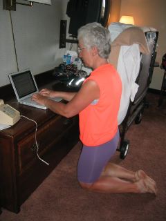 | roma, who has roomed with me several nights & gets a kick out of what i go thru to keep this web site going (i enjoy every minute of it), thot maybe you would like to see how i'm managing today's computing. with 3 of us in the room, we do lots of creative bag & bike storage, & i end up finding lots of ways to work near the phone jack. i actually do most computer work elsewhere, since i need the phone only for sending & receiving, so it's not all this uncomfortable. |