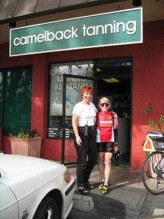 | lo & behold, a few doors down from the java garden, was another treat for us bikers---a tanning salon. what would we sunburned souls want with a tanning salon, you ask? it turns out that the very kind woman who operates the salon (in this photo with roma) was very generous about allowing us to use her bathroom facilities, & she did the same for the womantourists on last year's ride. we're grateful to her for providing us a clean, indoor restroom. needless to say, utilizing the roadside for potty stops didn't work in the city....except for the porta-potty that roma used at a construction site. |