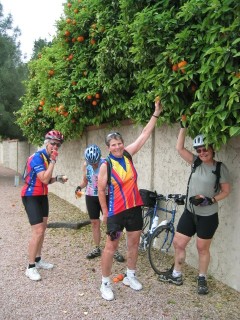 | the smells along our route today were magnificent. we think it must be all the orange trees in bloom. some of the riders found a wall with heavily-laden orange trees hanging over it onto the parking, so tried some. here are marilyn boger, frances with her head down, elaine, & rita. |