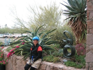 | we rode eastward on US60; the grade wasn't bad at all 'til we got within about 2 mi of gonzales pass, then we geared down to granny & pedalled up & over the pass, altitude 2651 ft. on the downhill, we came upon the boyce thompson state park arboretum. they grow lots & lots of cacti there, & also have many pieces of interesting southwestern sculpture on the grounds. here's a photo of becky at the entrance to the arboretum. |