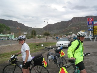 | the storms would come & go, but after about 45 mins we felt somewhat warmed up & decided to set off on the last 8 mi to the days inn in globe. catherine had come by with the womantours van to check on us, but we said we were going to ride the rest of the way, so she headed back up the mountain to check on all the riders behind us who had been much higher on the mountain when the storms hit. we learned later that some of them had experienced not only the strong winds & rain, but also hail. & there were more flat tires today, too. |
