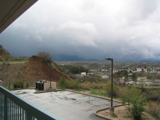 | a bit later i took this photo looking back westward across the city of globe from our motel toward the mountains in which we'd ridden today. those are the kinds of storms we'd experienced. |