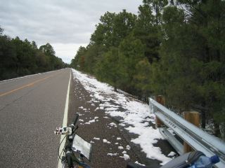 | once past the pass at about mi 47, we rode thru the apache national forest & past some campgrounds. it was sunnier earlier, but now it was windy & cold. you can see that they'd had snow recently. |