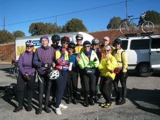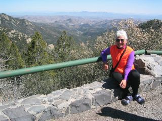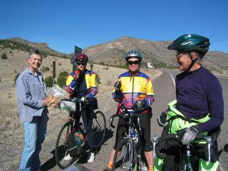 | how gorgeous it was today!! it was 36 degrees in silver city this morning, so we dressed warmly. most everyone left by 7 a.m. in the first few miles we went up & down some good-sized rollers. at about 10 mi we came to a vista into a huge, canyon-size pit that's a silver mine. the van was parked there, & it was at this spot that vicky shared with us the wonderful 'trail mix cookies' that her friend jean had sent. |