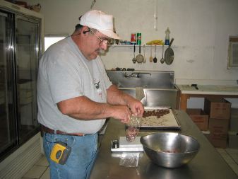 | a "nut shop"--davis mountains nut company--across the street caught our eye, so over we bounded. it was a teensy little stone building, & inside a fellow greeted us with, "oh good, someone to sample the new recipe i've just created." he then brought out a plateful of chocolate-covered pecans. was this heaven?? it turned out they were a new capuccino/chocolate-covered pecan, & they were delicious. we also sampled many other flavors of pecans from an open tin on the counter. we chatted for quite a while with david billing, who, with his brother gus, had started this pecan business 7 years ago in gus' kitchen. they now use over 10,000 pounds of pecans a year to create the scrumptious roasted & dipped nuts they sell. learn more about them here |