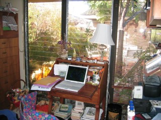 i want to show you the wonderful little office i have here at sari's home. "my" desk faces out all those windows onto the side patio where we often eat meals. i love my little niche; it'll be hard to leave on friday. |