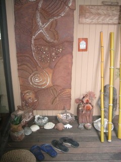 this is the front entry of the house, flanked by a large piece of pottery sari did over 30 years ago. she's been potting since her son erik was born....about 38 years ago. there's a huge variety in the types of pieces she does; it's fascinating. note in the photo the shoes near the door; no outdoor shoes are worn into the house. note also the large lengths of bamboo. peter enjoys growing bamboo. there's lots of it everywhere of all sizes & colors...growing in the garden & also cut pieces. sari even uses some of the tinier pieces in creating her pottery. |