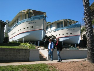 | after a breakfast of peter's oatmeal & lots of toppings, we put ourselves & our bikes together & piled everything into the gantzel pickup. peter drove us north about 30 mi to oceanside. we had hoped to go further to--the north edge of camp pendleton. sari & peter have ridden thru the marine base before & they say the views from the base's oceanside roads are beautiful. but the marines at the south gate said that policy changed last year, as we expected, so we couldn't ride thru the base. so peter dropped us off at the harbor in oceanside. |