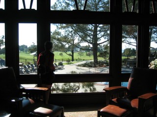 | sari & i went into the lodge, oohing & ahhhing at the beautiful wood & other appointments. this photo was taken from inside the lodge looking out across the golf course. i'm sure no one could mistake us for golfers in these getups, but folks were very nice to us, anyway. |