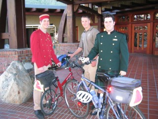 | upon leaving the lodge, we were again met by the young gentlemen outside the front door, who quickly retrieved our bikes from safekeeping. they asked how far we'd biked today & we told them about 28 mi, which they thot was quite a lot. so of course we had to tell them about the longer ride we have in mind to do soon. |