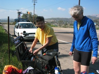 | the climb lasted about 7 mi. at one point on a more level stretch, sari & i came across bev stopped along the roadside working on her bike. it turns out that her bike seat had come off the seatpost. she felt lucky that it had happened as she was coming to a stop. otherwise....OUCHY!!! francis came along in the subaru (our sag vehicle) & got out her tool kit in hopes of finding tools that would help bev attach the seat. |