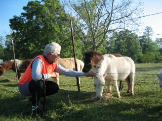 | along the stretch to dolen i spotted a pasture where about a dozen miniature ponies were cavorting. i thot they might run off when we stopped & approached them, but au contraire. they romped over to the fence to say hello....as you can see in this photo of me petting a pony nose. |