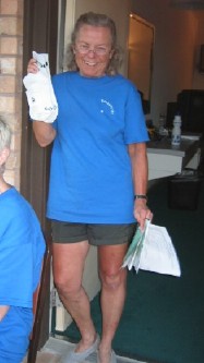 | elaine made the BITCH socks presentation to loralee (in photo)....in appreciation for the delicious brownies loralee treated us to last week; the new acronym label is Brownies In Texas Considerate Caring Compassion Helpful (elaine decided if one C word is good, more than one is even better). |
