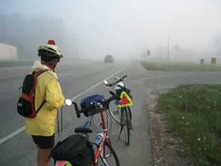 | our biking day got off to a very foggy start....as you can see in this photo taken as we neared the edge of town. |