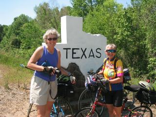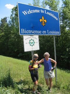 | then we jumped on our bikes, rode over the bridge spanning the sabine river, & dismounted again so i could take this photo of patty & sari at the official louisiana welcoming sign. perhaps you can also see the smaller sign indicating that the state is celebrating the bicentennial of the louisiana purchase this year. |