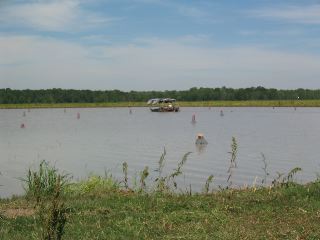 | & we learned that they rotate crops--one year the field is in rice, the next year it's a crayfish field; the crayfish feed on the rice stubble. here's a photo of a crayfish field. those little things sticking up are the tops of crayfish baskets. the boat cruises over the top of the water, & the fellow operating it grabs the individual baskets, pulls each one up onto the boat, empties out the crayfish, then replaces the basket & moves on to the next one. |