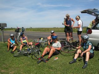 | at about midway in the longer version of today's route, we came upon a sag stop; riders had stopped to rest & eat the sandwiches they'd packed. from left, seated, are karen, patty elliott, donna, bryn, & sandy. standing are patty fainer & roma. (carolyn is behind patty f.; i can't tell who's getting things out of the back of the subaru.) |
