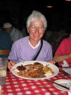 | oh my oh my, the menu was brimming with tempting choices. not able to select one dish, i ordered the grilled seafood platter, which included catfish, alligator, oysters, shrimp, stuffed crab....golly, i don't know what all, but all delicious. here i am with my catch of the day. |
